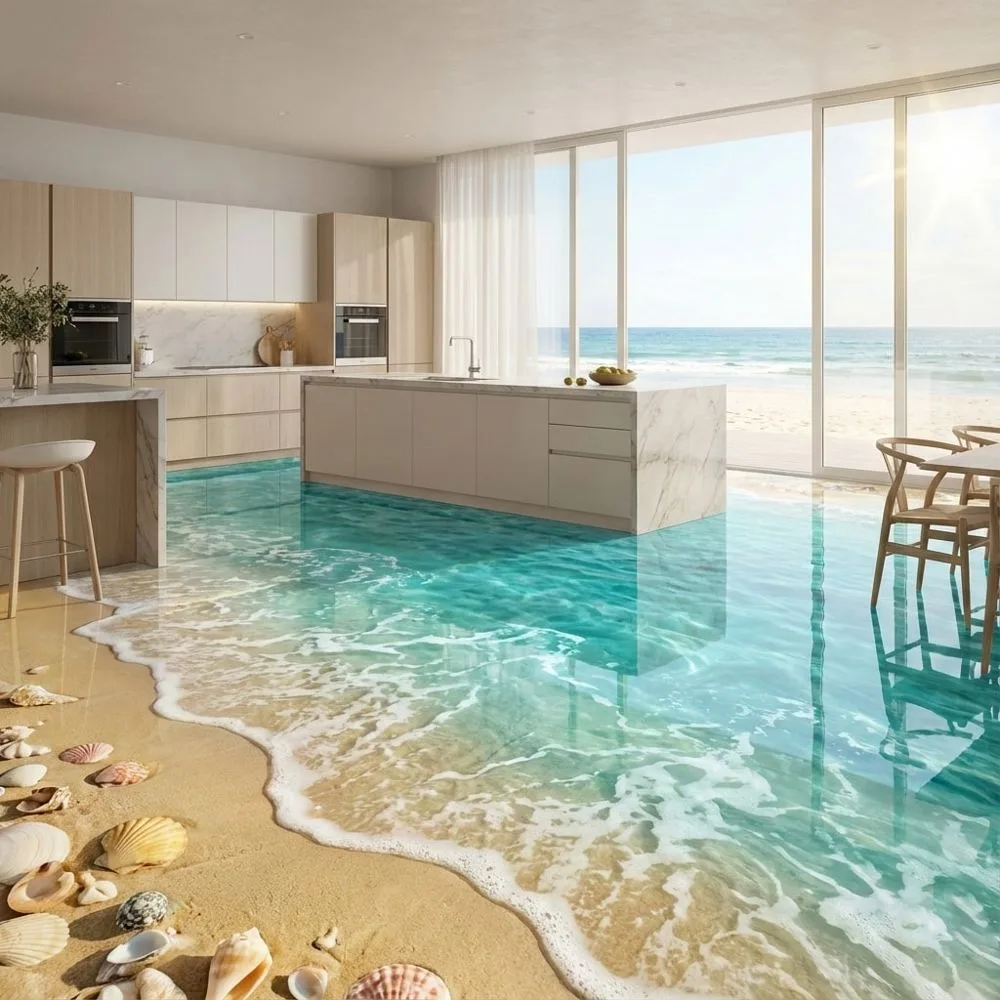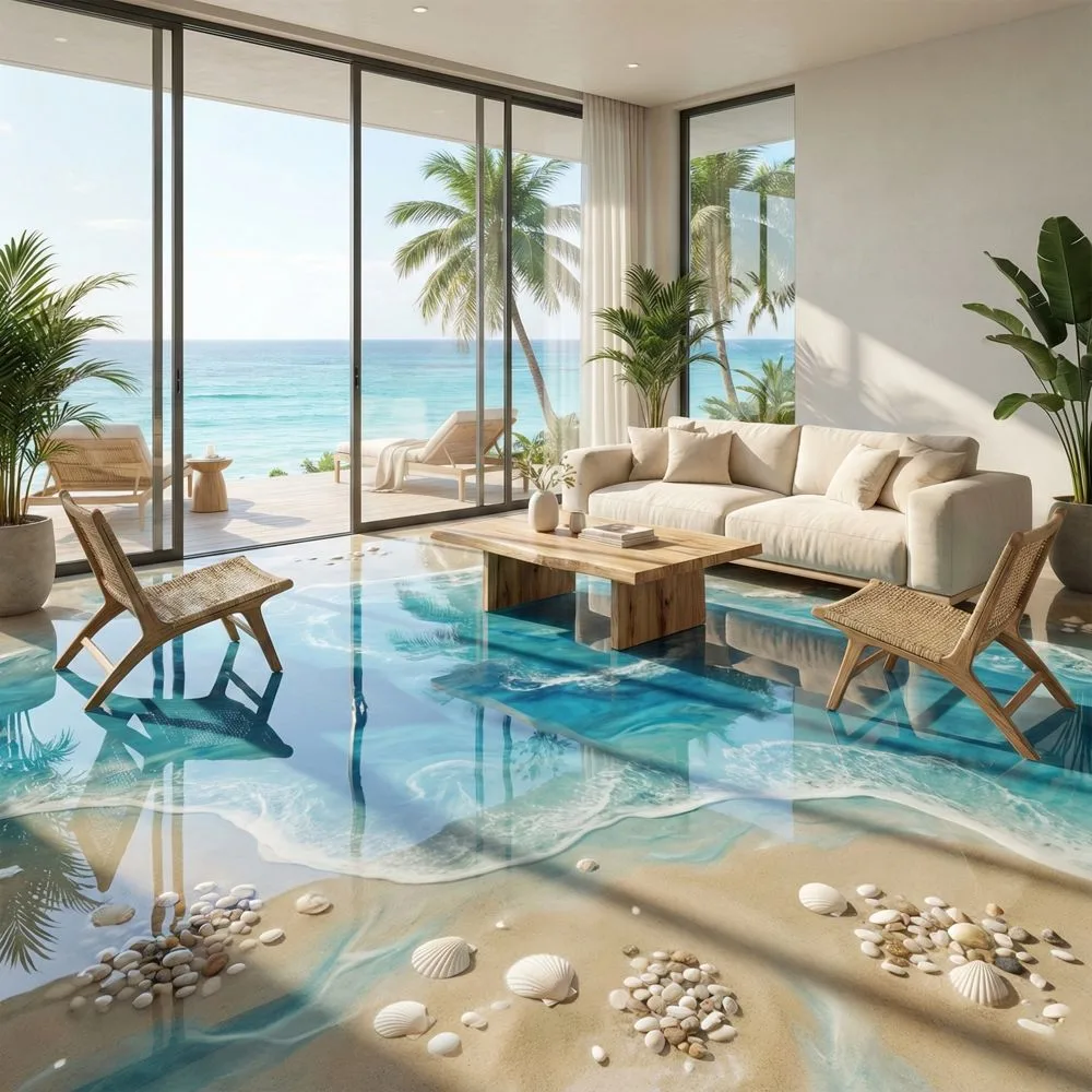The design options for an epoxy beach floor are limited only by imagination and budget. Traditional beach scenes feature sandy shores transitioning into aqua waters with white foam details that mimic waves lapping at the shore. These classic designs work beautifully in bathrooms, where they create spa-like atmospheres that promote relaxation and tranquility.