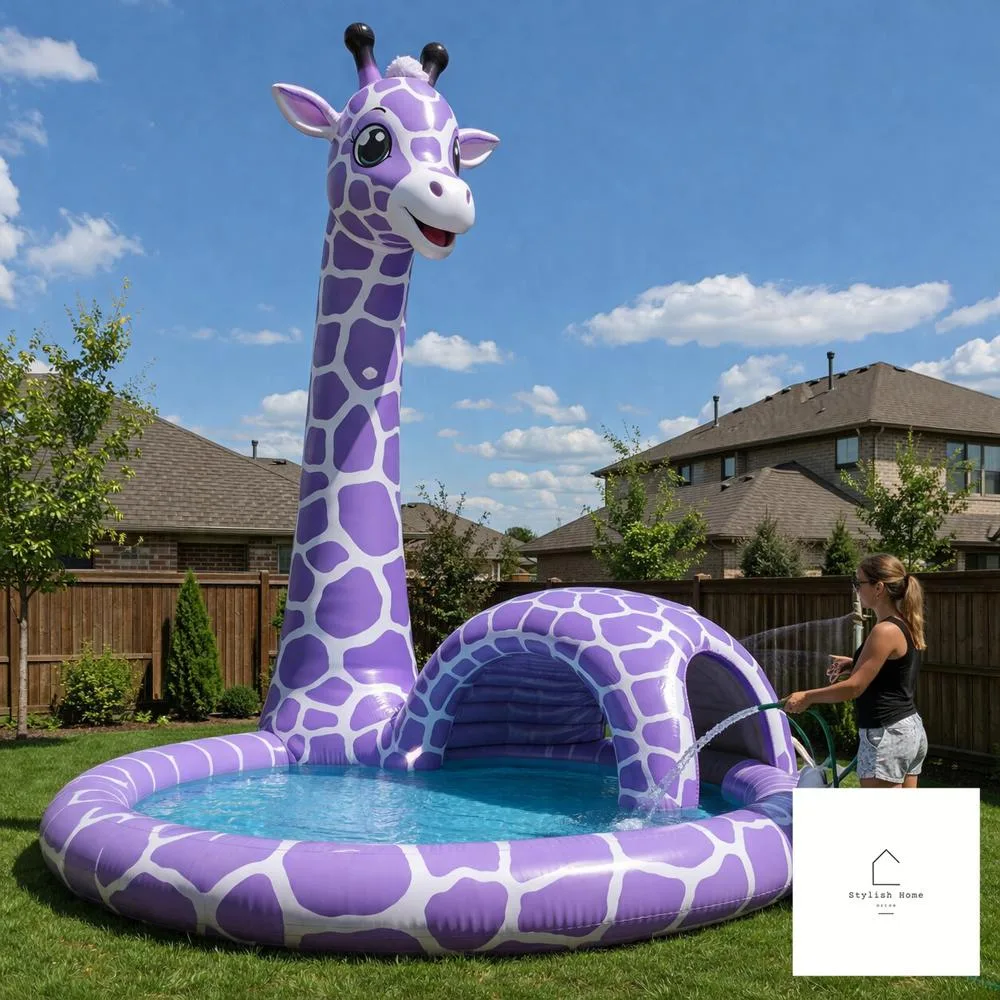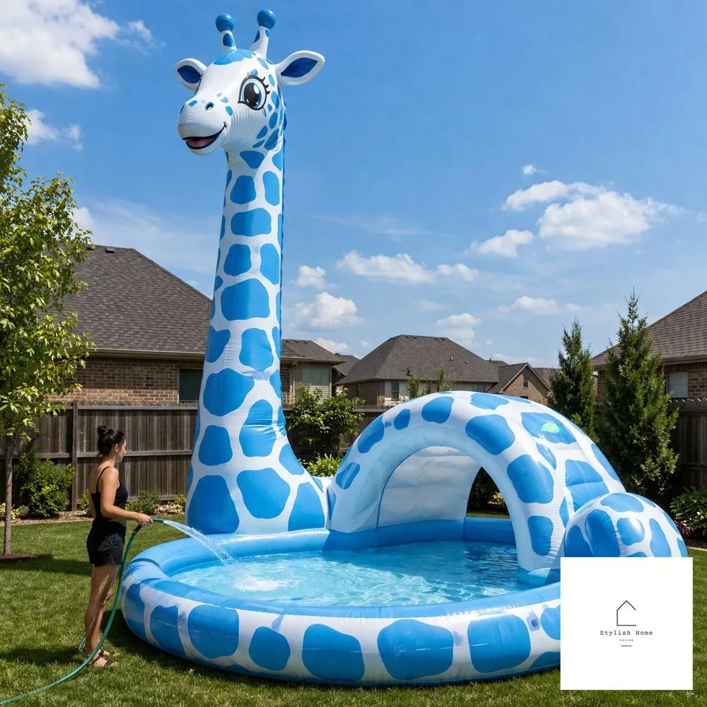 Larger versions of the giant inflatable giraffe shaped pool exist for older children — deeper, wider, and sometimes incorporating a slide or spray feature into the design. These seasonal backyard setups can provide months of entertainment and are genuinely more economical than repeated trips to commercial water parks.