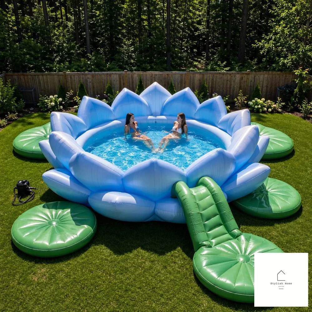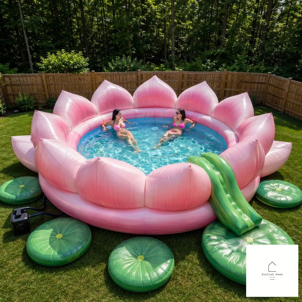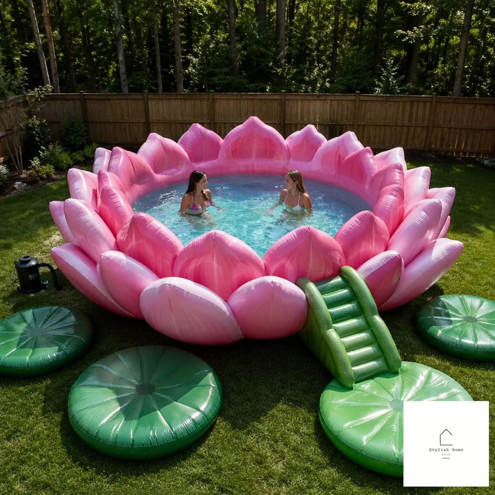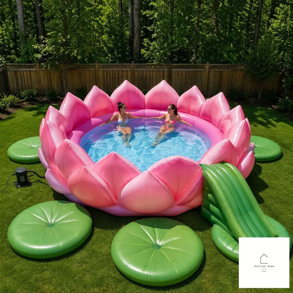 Anchor your giant inflatable lotus pool float in the center or deep end of your pool. Surround it with smaller accent floats — lily pad floats, flower petal rings, even simple round floats in coordinating colors. Add some outdoor string lights for an evening party, scatter some floating LED lights in the water, and suddenly your backyard looks like a scene from a travel magazine.