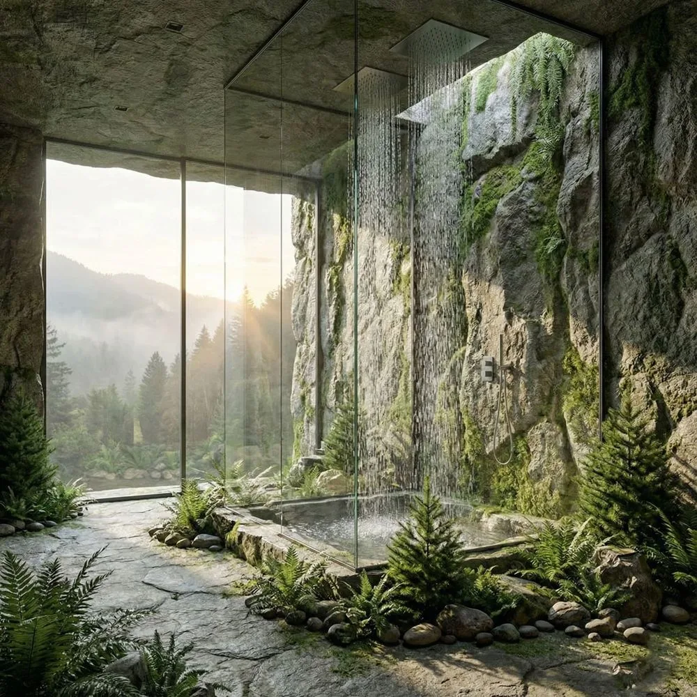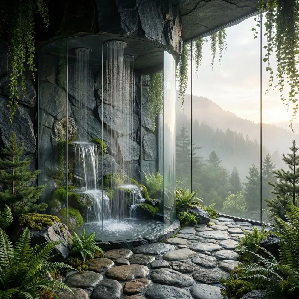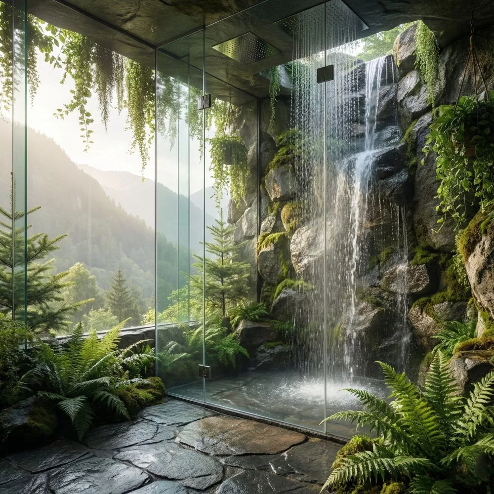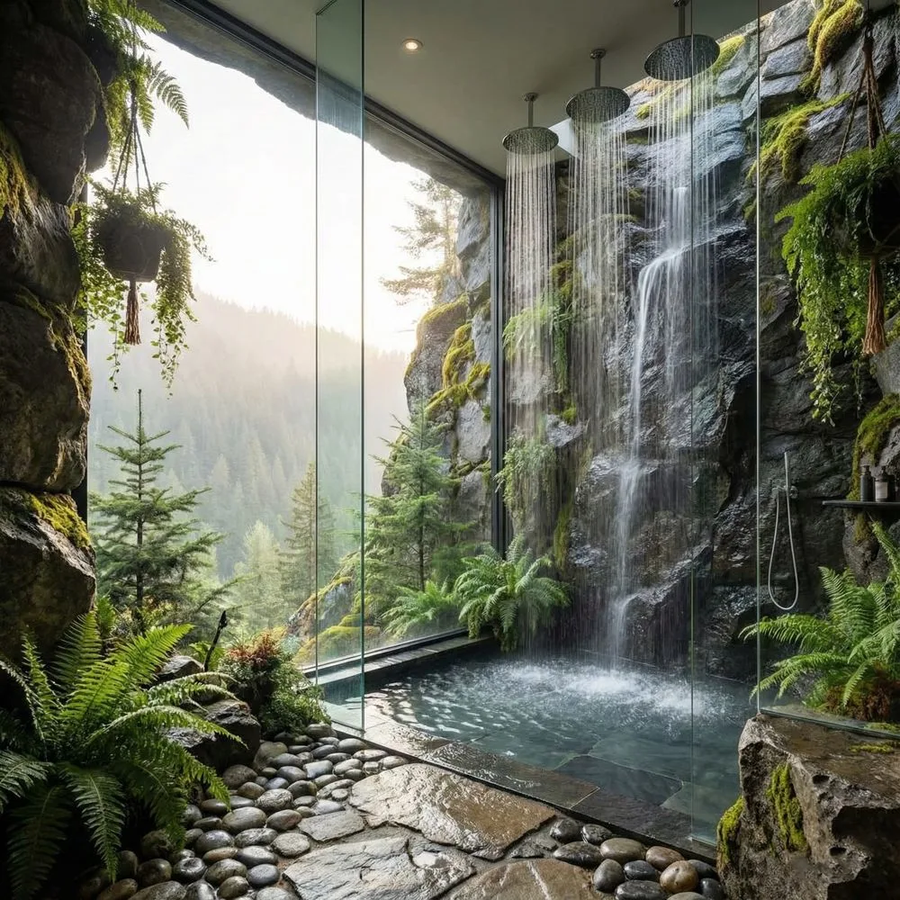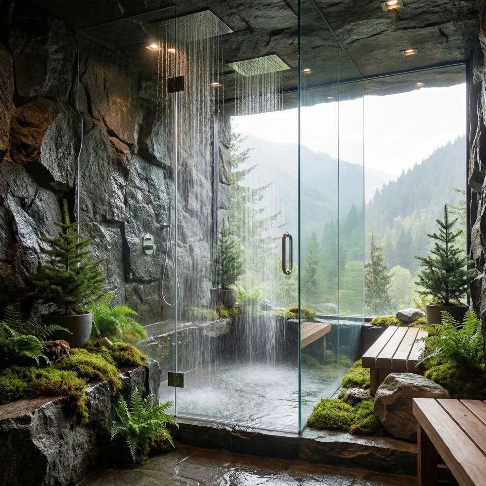 Smart glass technology can transform from transparent to opaque while displaying nature imagery, offering both privacy and visual interest. Some systems even allow video playback, bringing moving water, swaying trees, or drifting clouds into your shower space.