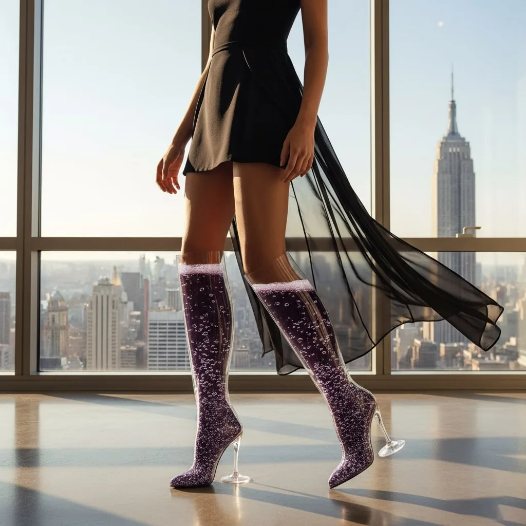 What makes wine glass boots extraordinary is their dual identity. They are not merely accessories; they are sculptural objects. Each pair reflects intricate craftsmanship, often featuring transparent heels shaped like inverted wine glasses or glass-like acrylic forms that mimic the glimmer of crystal under light.
