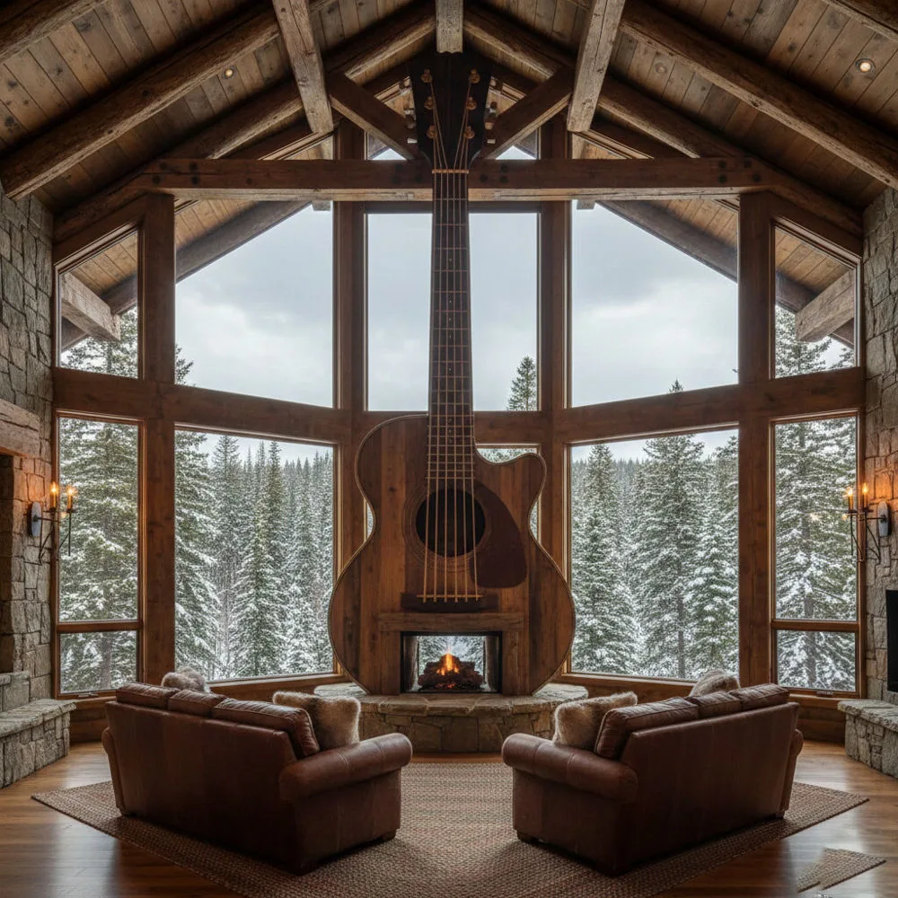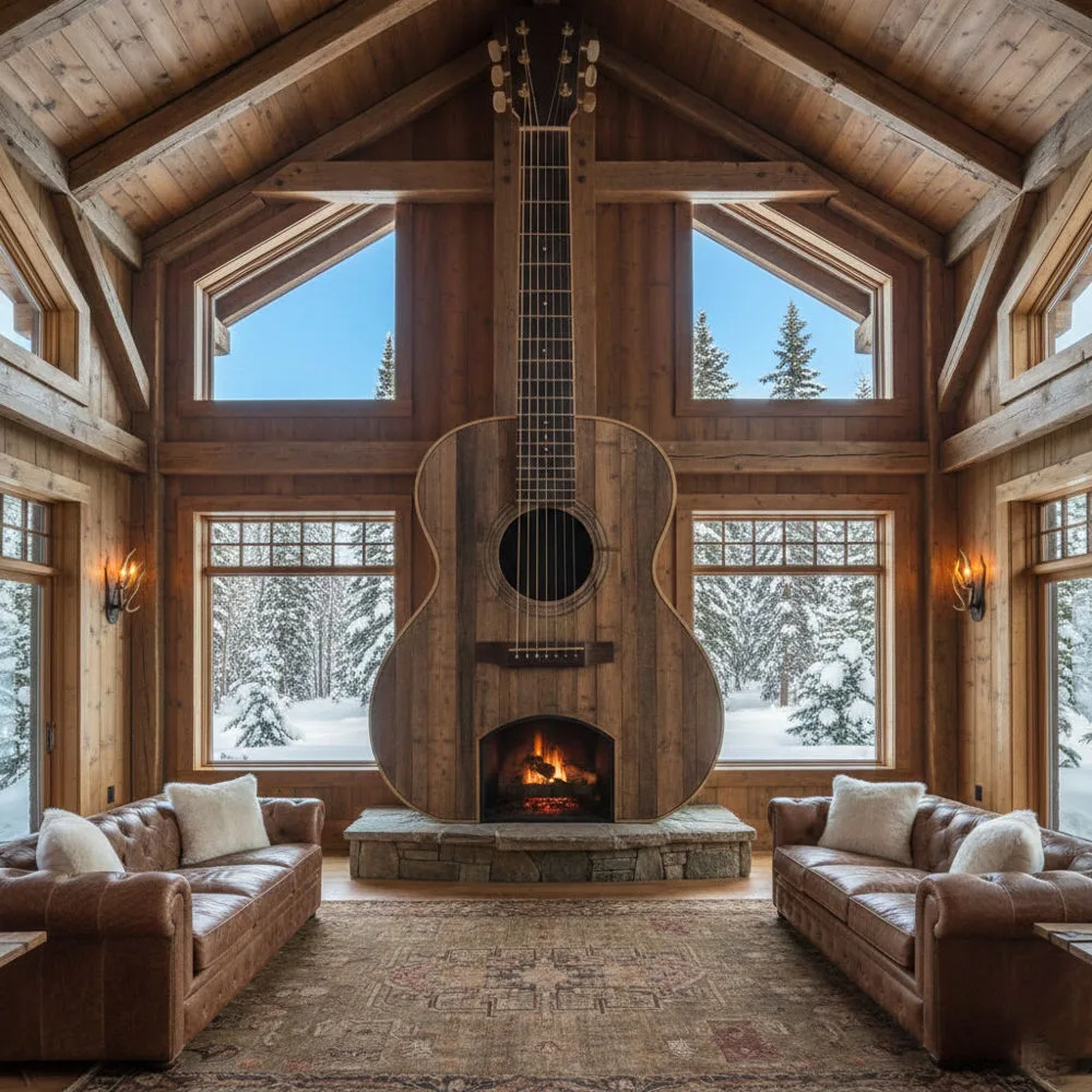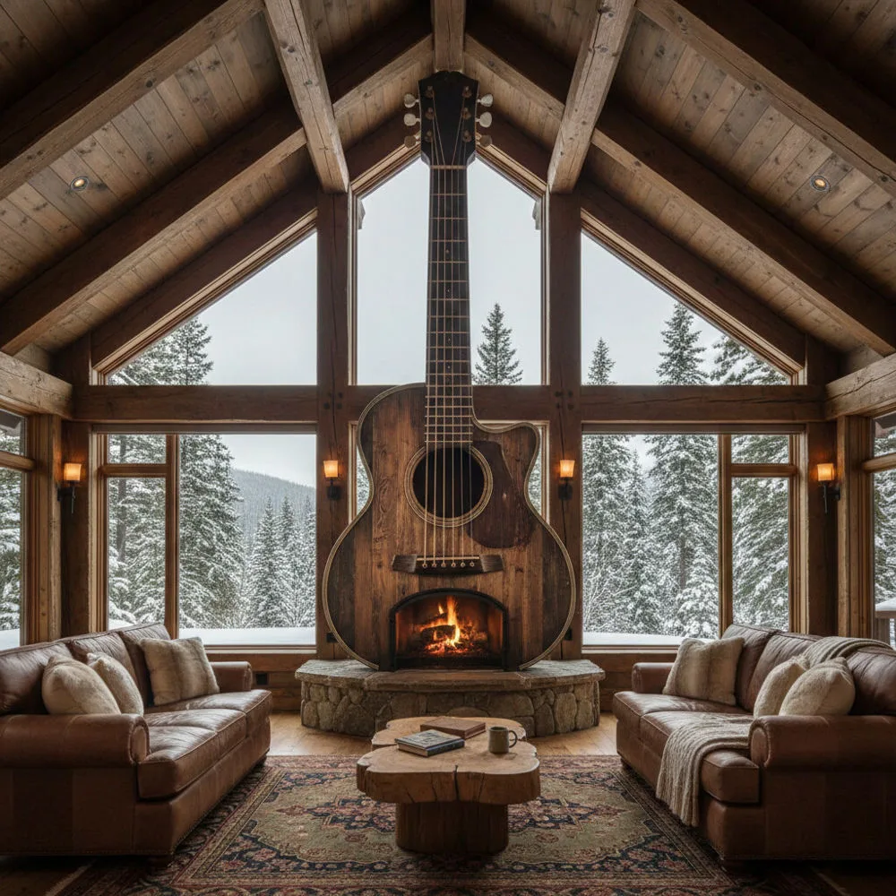 These traditional designs work beautifully in rustic cabins, music studios, entertainment rooms, or any space where you want to celebrate acoustic heritage. The warm tones of the wood complement the natural glow of the fire, creating an atmosphere that’s both cozy and inspiring.