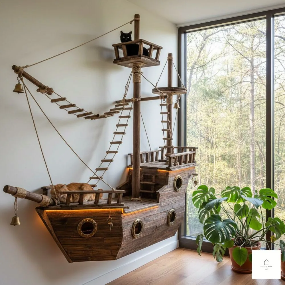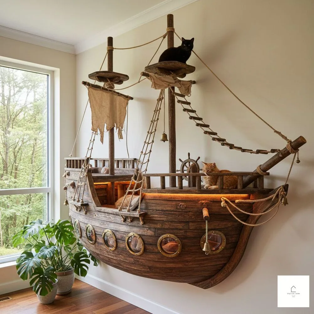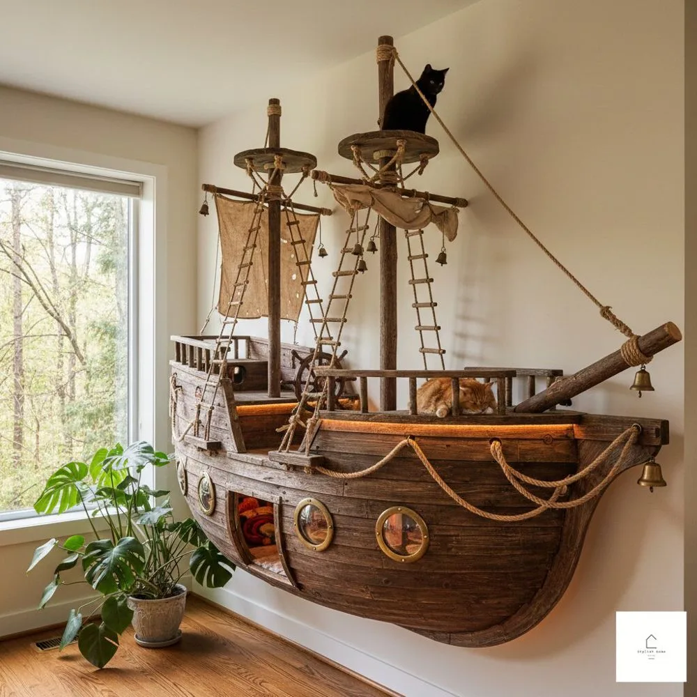 Theme each section differently for variety. The bow could feature a figurehead that doubles as a scratching post. The stern might include a ship’s wheel mounted on a platform where cats can sit and “steer” their vessel. Midship areas can house cozy cabins with soft bedding for napping between adventures.